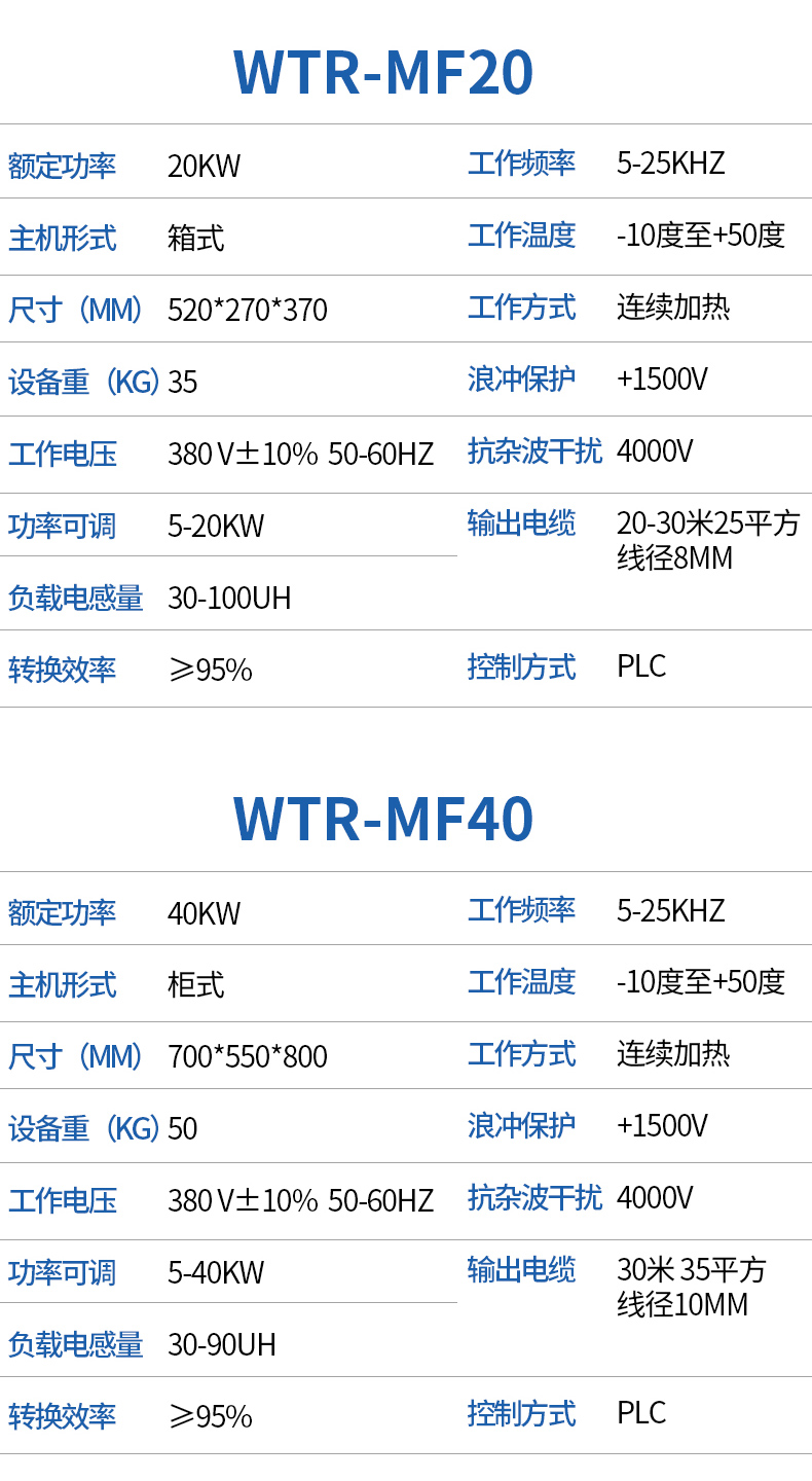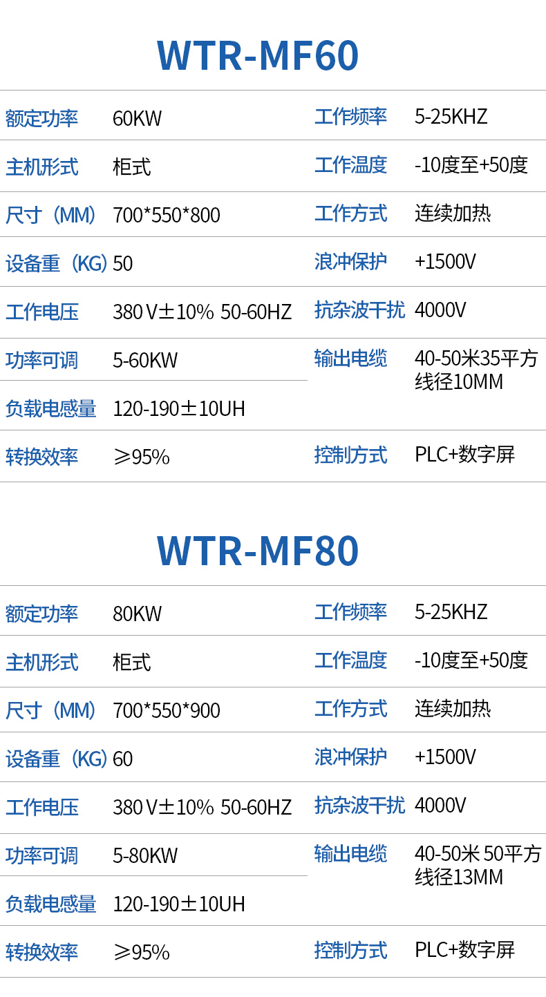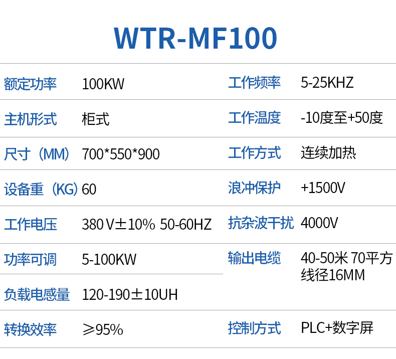 - WTR-MF系列中频/高频感应加热电源为DSP+IGBT结构的高效节能产品;该产品为IGBT逆变、并采用DSP进行全数字式精确控制,在各种工况下能始终保证IGBT工作在ZCS(零电流开关)状态;全空冷结构大幅度降低了电源损耗,并彻底消除了设备来自水路系统的故障;多种运行控制模式以及可设置的功能使设备可以适合几乎所有感应加热场合的工艺要求;完善的限制保护措施使得设备在各种工况下保持连续安全运行。
